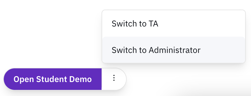 You'll always see these two buttons throughout the demo, allowing you to watch your time remaining, and switch between the 4 roles: Student, Instructor, TA, and admin.